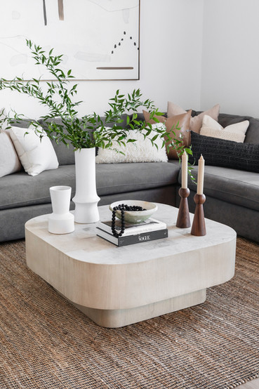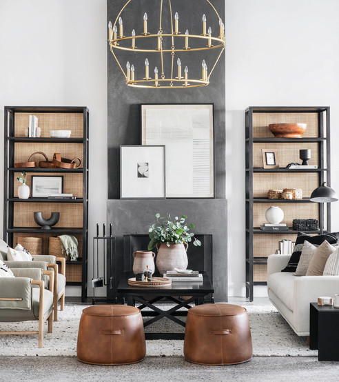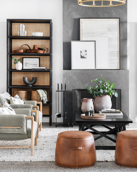 A neutral colour palette is always a great foundation for a luxurious space. We love adding black contrast to a calming neutral base to elevate the look. The high contrast of the bookshelves, coffee table, and side table in our Sculptural Statement living room vignette draws you in and invites family and guests alike to sit down, relax, and enjoy. The curated styling of this space plays with scale, form, and texture to add a collected, lived-in feel.