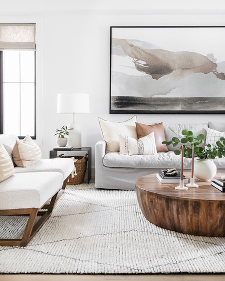 Modern artwork makes a luxurious statement in any space. We used this striking abstract piece in our own living room to add a curated feeling that ties the entire look together. We also love the rich leather ottomans and the plush, textured rug underfoot. Both pieces warm up the overall cooler tones of this space.
