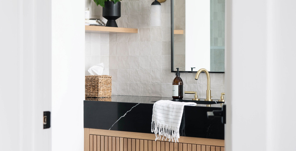 In our own ensuite, we carefully planned custom millwork solutions to help us avoid a cluttered countertop and maintain the serenity we had envisioned for the space. Our custom-built vanity combines functionality with elevated details for a bold focal point that is entirely unique to our space. We also chose to make use of potentially wasted space at the end of the vanity with open wood shelving for additional storage and select decor.